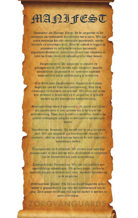 Wij zijn ZorgVanguards. Samen zullen we de zorgsector transformeren, niet alleen voor de huidige generatie, maar ook voor degenen die na ons komen. Sluit je bij ons aan en maak deel uit van deze revolutionaire beweging.
